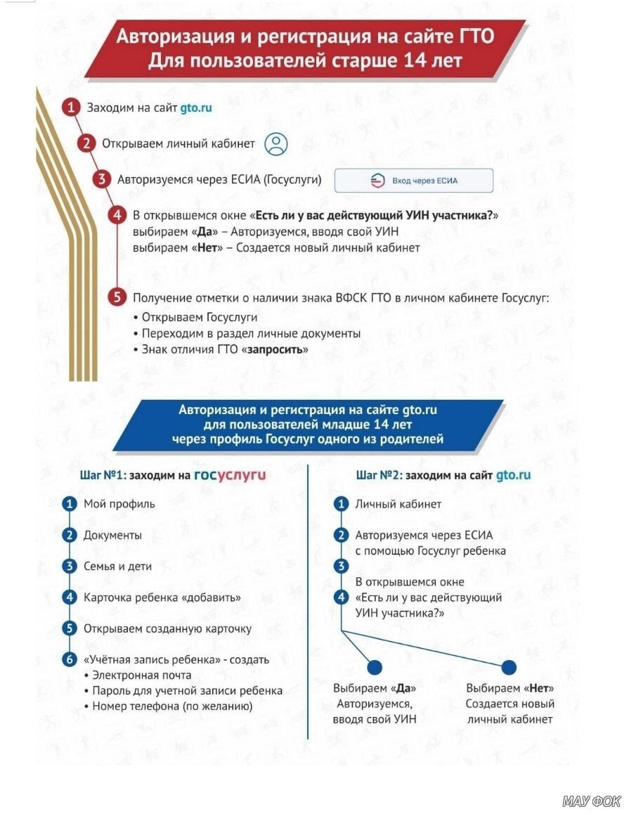 Для участия в программе «Готов к труду и обороне» (ГТО) необходимо зарегистрировать ребёнка на официальном сайте gto.ru. Порядок регистрации зависит от возраста участника.